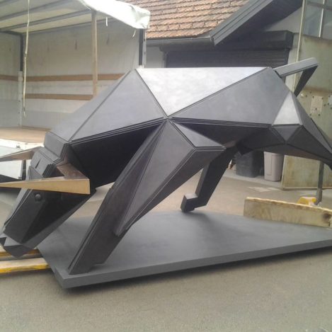 Based on developed shells, we cut up the bronze sheet metal (using a laser or water jet), and then bend and weld it (using MIG or TIG procedures) into the final form of the 3D model.
